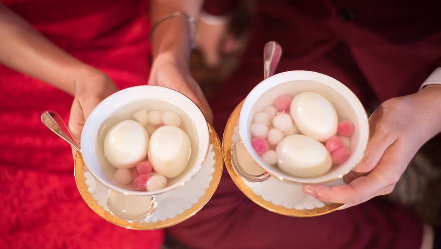 เมื่อฝ่าด่าน ประตูเงิน ประตูทอง ของเพื่อนเจ้าสาวมาแล้ว จะทำพิธีมอบสินสอด หมั้นหมายสวมแหวนแต่งงาน และทานขนมอี๋ หรือบัวลอย ไข่ เจ้าบ่าว และ เจ้าสาวจะต้องทานไข่ทั้งลูกในคำเดียวด้วยนะ